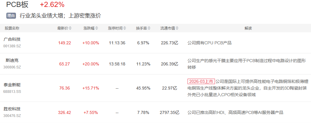 PCB板块当日同样迎来大幅上涨,胜宏科技盘中一度涨超10%,沪电股份盘中刷新历史新高,广合科技封板,斯迪克20cm涨停。