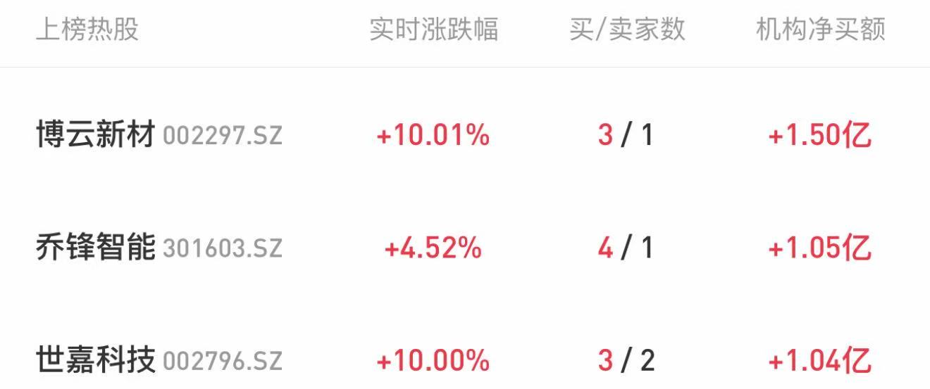 今日机构龙虎榜上榜34只个股,其中净买入17只,净卖出17只。当日机构净买入最多的个股前三位是:博云新材(1.50亿)、乔锋智能(1.05亿)、世嘉科技(1.04亿)。