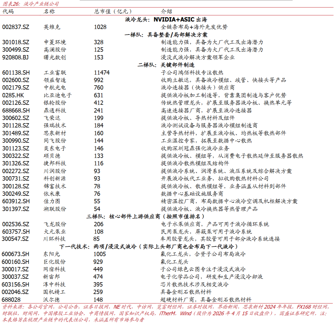 关注英维克(液冷全链条+系统级龙头+出海先发优势);以及申菱环境(海外市场拓展能力)、高澜股份(国际化布局)、飞龙股份(核心上游),科创新源(后道代工),东阳光(氟化物+部件)等。