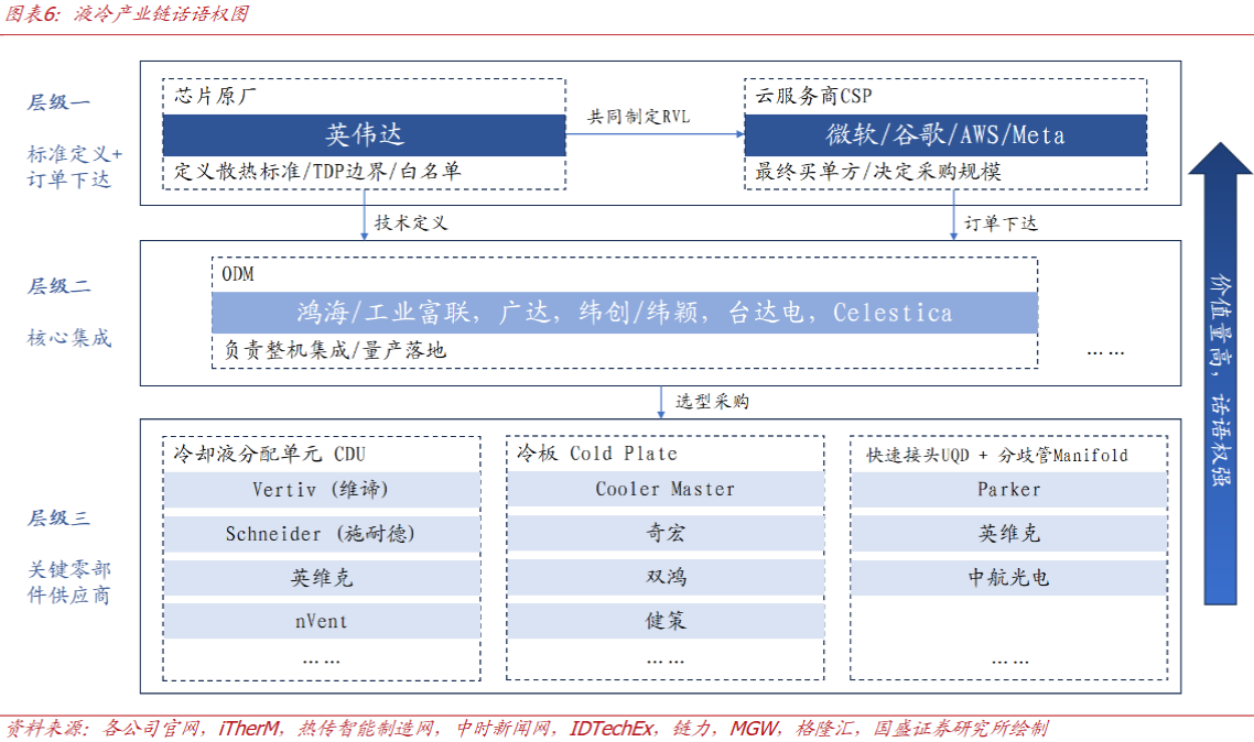 液冷并非单一零部件产品,而是贯穿芯片、服务器与数据中心的系统级工程,其产业链参与方众多,但话语权集中度高。从决策链条看: