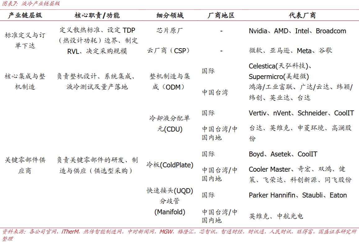 液冷厂商:提供冷板、CDU、管路、manifold、UQD 等关键系统,单一厂商或可提供多种品类,份额根据具体项目决定。
