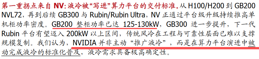 首先,在NV最新算力平台中,液冷并非客户选项,而是平台形态的一部分。从GB200NVL72开始,液冷已被写入交付逻辑:只要平台出货,液冷就同步出货。这是液冷需求确定性最高、最容易被低估的来源。