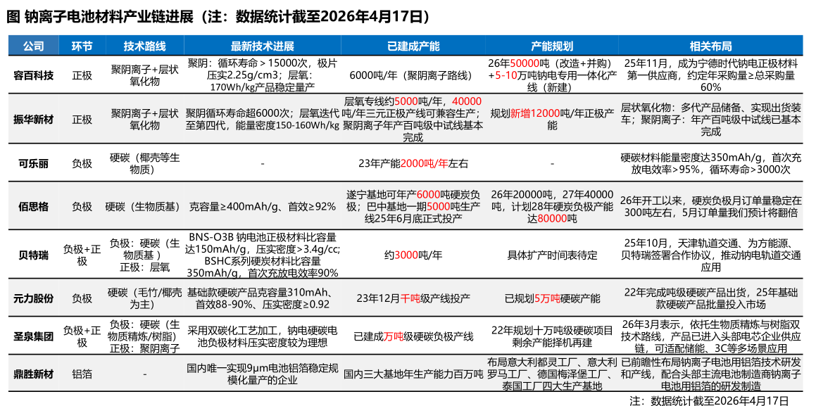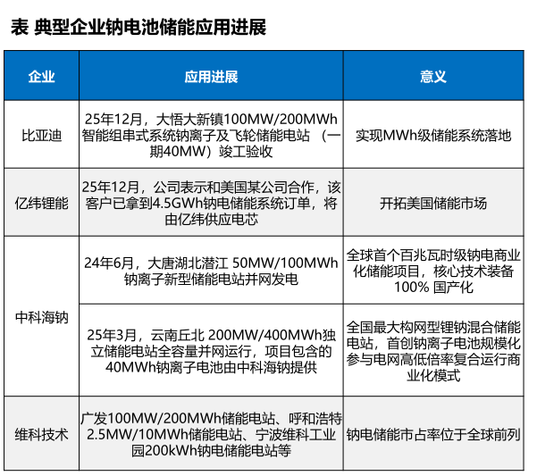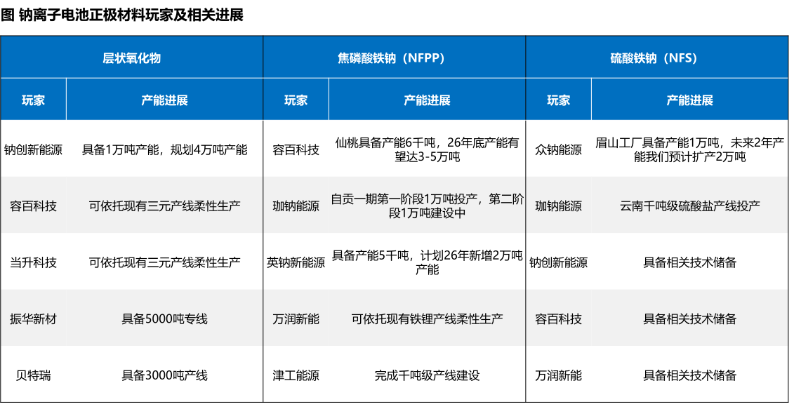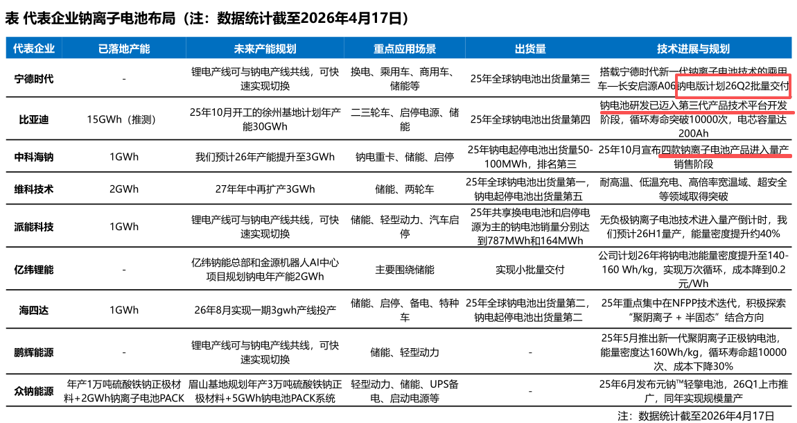 宁德时代、比亚迪凭借全产业链布局、规模化产能与技术迭代能力,稳居行业第一梯队,是钠电池产业化的核心引领者。