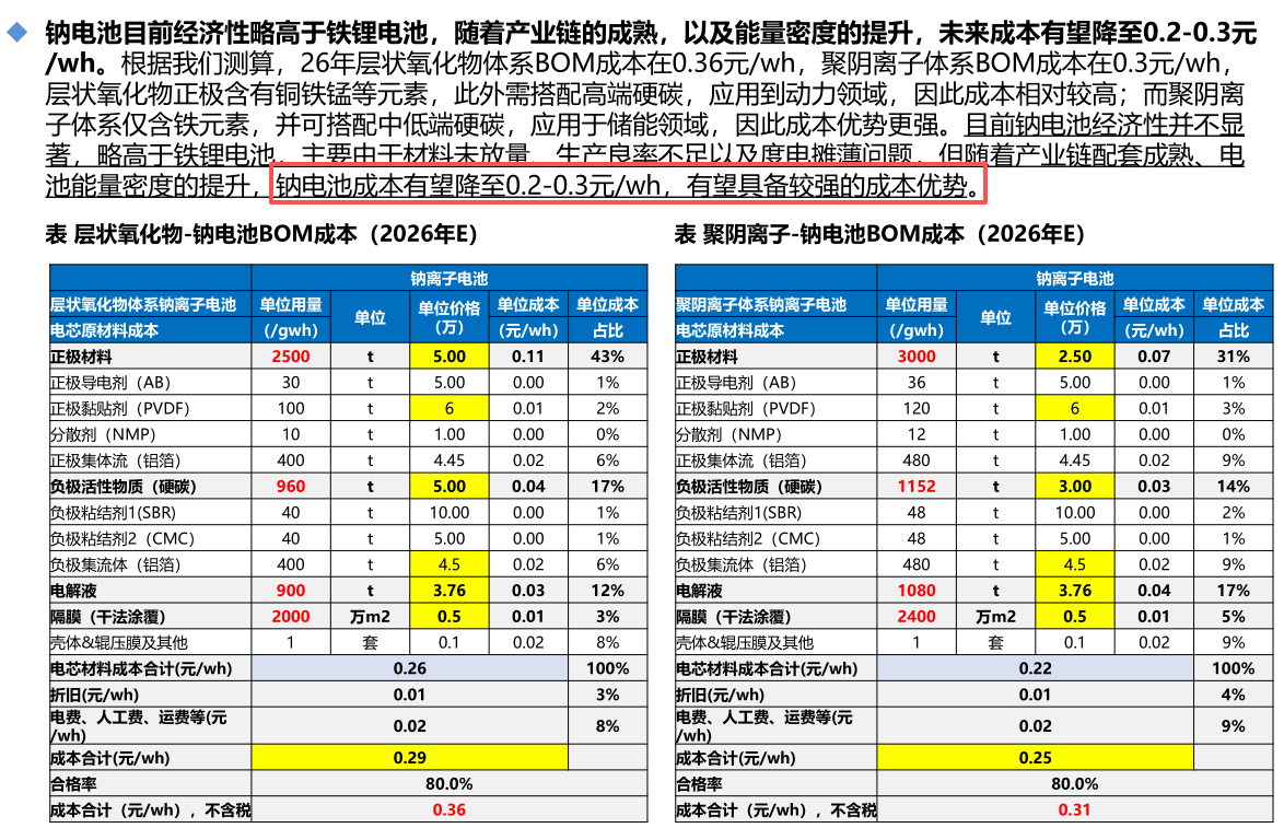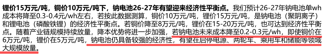 在当前锂价15万元/吨,铜价10万元/吨下,钠电池已经与锂电池平价,规模化后,成本仅为锂电池的一半。