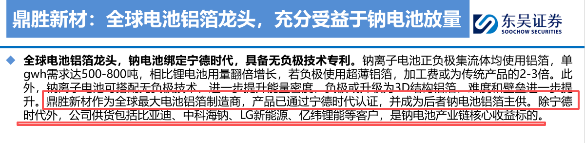 钠离子电池材料环节中,细分赛道竞争格局分化,其中铝箔环节竞争格局最为集中,鼎胜新材绑定宁德时代一家独大。