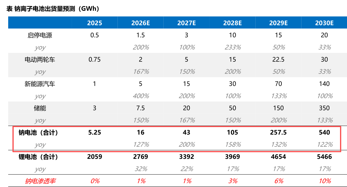 据测算,25年钠电池出货量超5GWh,26年钠电池出货量突破15GWh,27-28年具备经济性优势,30年规模有望超500GWh,未来渗透率有望突破30%。