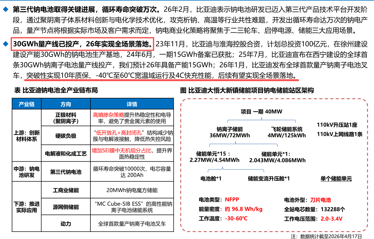 比亚迪宣称储能要发展,必须要用钠,用锂是不能够匹配的,钠电池是储能必须甚至唯一的选择,钠电池循环寿命可以达2万次,是储能天然战略的一个配对。