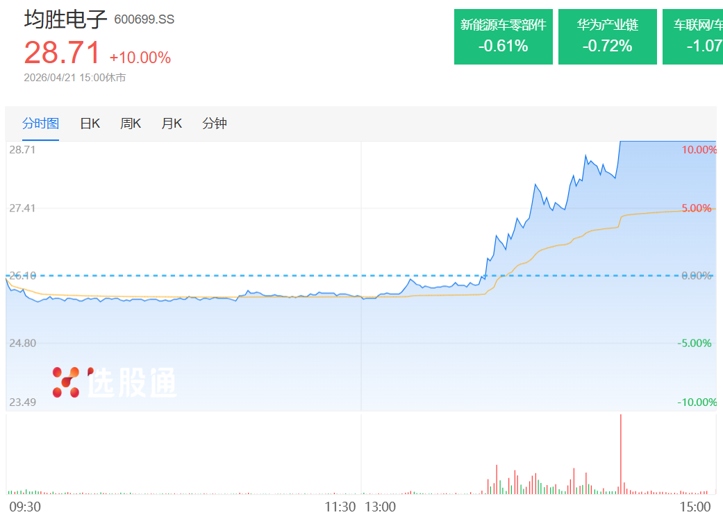 均胜电子午后突然开始放量拉升,一波连续走强后,于尾盘逆势拿下涨停板。