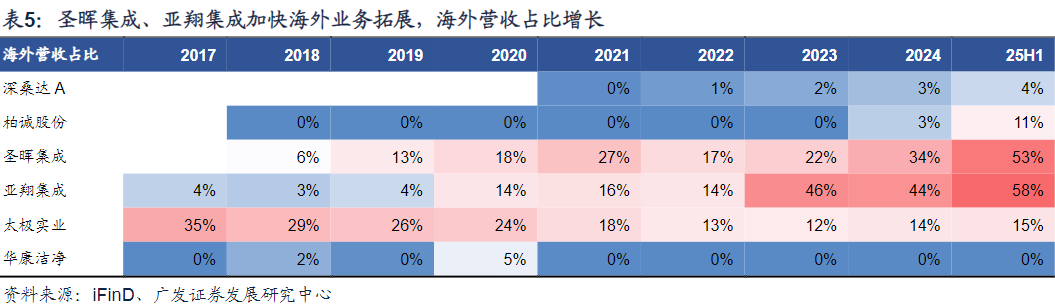海外订单大幅放量下,母公司具有丰富海外客户资源的台资企业或持续转向高毛利海外订单,如2021-25H1,圣晖集成海外营收占比由27%提升至53%,亚翔集成海外营收占比由16%提升至58%。本轮国内存储扩产项目或由深桑达A、柏诚股份占有较多份额。
