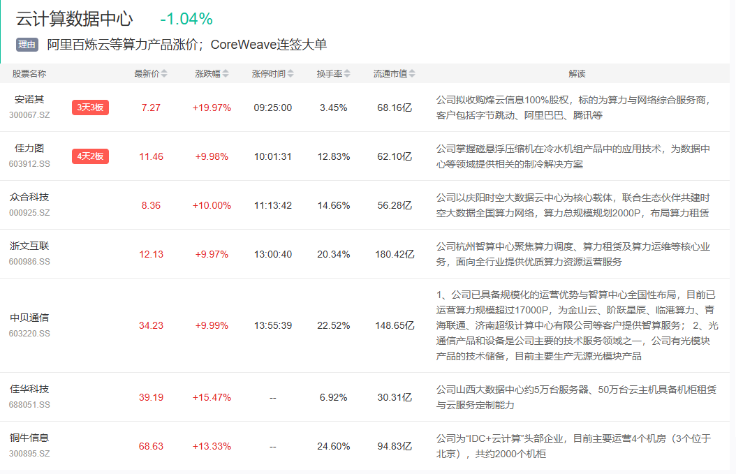 算力租赁板块反复活跃,宏景科技一度涨超7%,利通电子收涨逾7.6%,佳力图、中贝通信双双涨停,铜牛信息涨超13%。