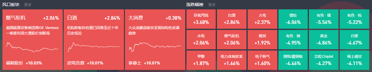 消息面上,美股能源设备制造商GE Vernova隔夜大涨超13%。该公司一季度营收表现高于市场预估,并同步上调全年营收及自由现金流预估,其亮眼业绩直接带动A股燃气轮机概念板块情绪升温。