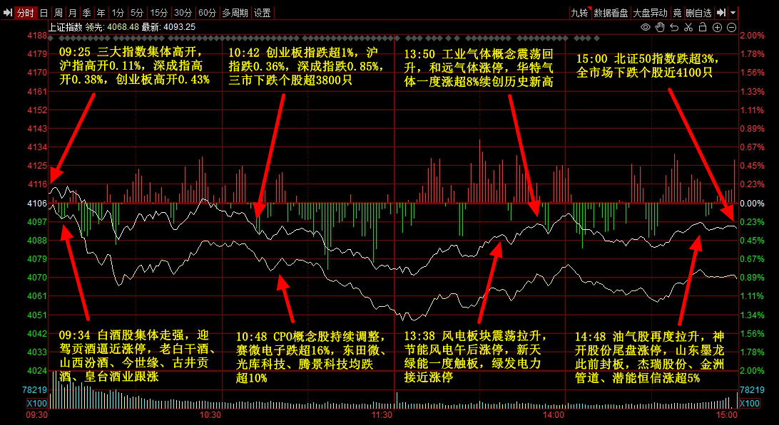 今日市场全天高开低走,三大指数集体下挫,北证50跌幅约3%。个股跌多涨少,沪深京三市下跌个股超4000只,市场情绪偏弱,全日成交额逾2.82万亿元。板块分化明显,绿电、燃气轮机、电子特气等概念逆势活跃,部分个股涨停;有色板块整体下挫,中稀有色跌停;CPO等算力硬件股遭遇调整,赛微电子、东田微跌幅均超10%。