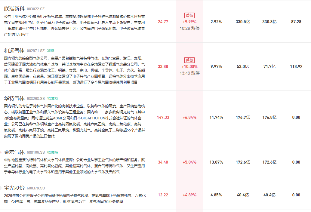 电子特气板块前排龙头继续活跃,华特气体涨超6%,金宏气体、蜀道装备双双涨超4%,低位和远气体收获涨停。