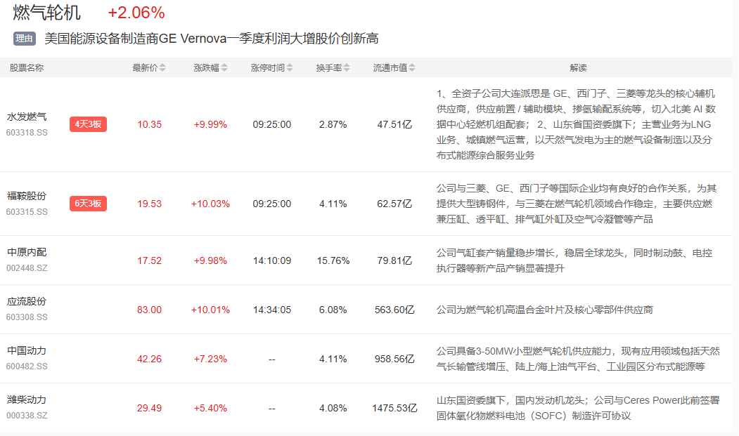 燃气轮机板块今日强势,多股涨停;福安股份一字涨停,水发燃气实现4天3板,中原内配、应流股份双双涨停。