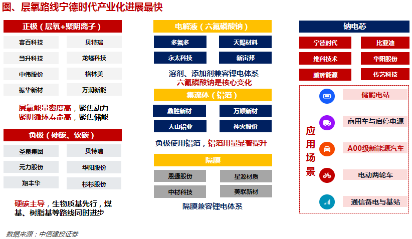正极方面,钠电正极主流路线为层状氧化物和聚阴离子,其中层氧路线能量密度高适用于动力场景,聚阴离子路线循环寿命高适配储能场景。层氧路线宁德时代产业化进展最快,中科海钠进展也较快,聚阴离子路线维科技术量产进度领先。