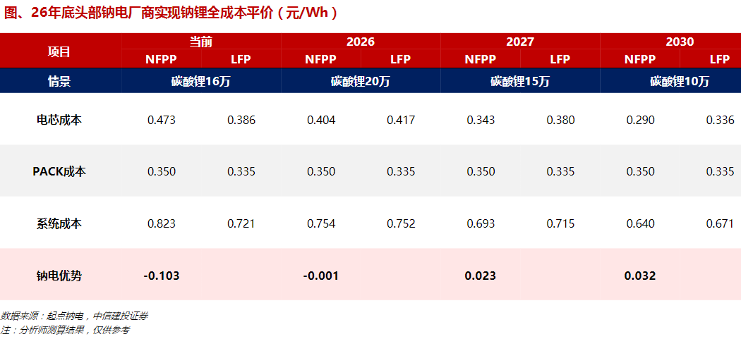即使考虑Pack环节贵1-2分/Wh,判断26年头部钠电厂商电芯成本将打平锂电,27年钠电头部厂商将具备2-3分的盈利优势,将开启平价放量时代。