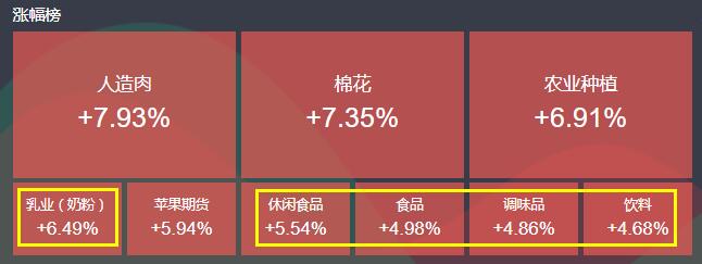 不管是休闲食品(5.54%)、调味品(4.86%)、乳业(6.49%)、饮料(4.68%)都迎来大涨。