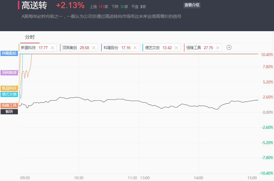 科隆股份六连板为板块打好主基调,昨日正式公告披露高送转的顶固集创开盘秒板,新晨科技、德艺文创也快速涨停。