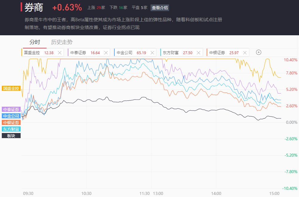 上午券商板块一度涨超4%,最终仅收涨0.63%。