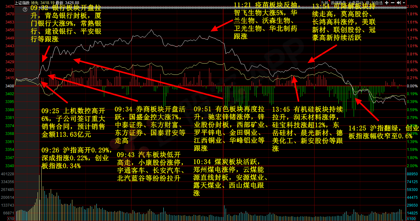 银行板块早盘一度冲高超4.5%,带动上证指数、上证50、A50期指集体冲高。