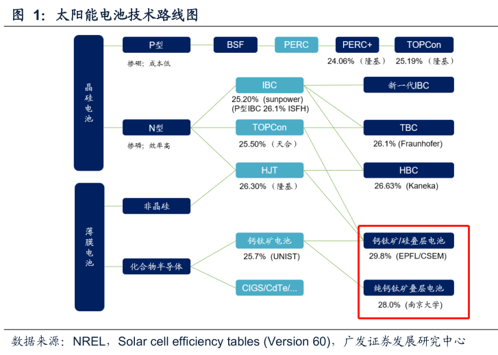 南京大学研发的钙钛矿/钙钛矿叠层电池,效率28.0%;EPFL/CSEM研制的钙钛矿/硅叠层电池,效率31.3%,未来还将持续发展突破。