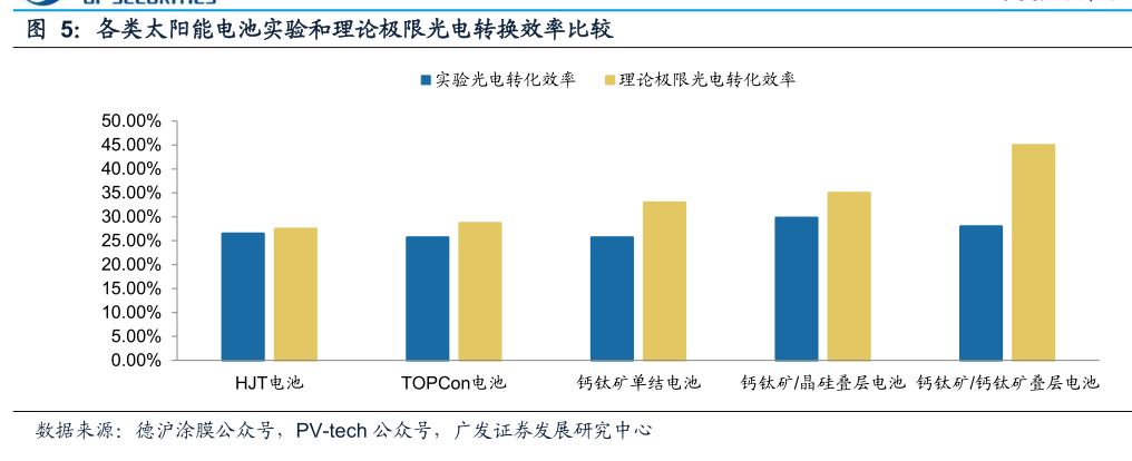 钙钛矿叠层电池光电转换效率有望达到45%以上,含有多个吸光层的叠层电池,分别吸收不同波长的阳光,提升了光的利用率;两结电池理论极限效率45%,三结极限效率49%。