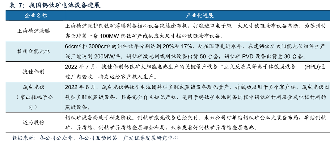 国产设备厂商德沪涂膜、众能光电、捷佳伟创、晟成光电(京山轻机子公司)、迈为股份、帝尔激光等积极布局钙钛矿电池设备研发。