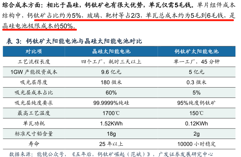 钙钛矿太阳能电池是以钙钛矿型(ABX3型)晶体为吸光层的新一代薄膜太阳能电池,钙钛矿光吸收系数高、材料成本低,钙钛矿电池结构简单,制造工艺流程短,生产能耗低;